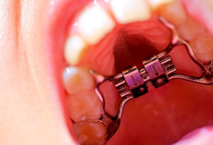 「モーラースライダー」と呼ばれることがありますが、Mesialslider(メジアルスライダー)はスクリューを固定源として、歯を前方へ移動させ、スペース閉鎖を行うための装置です。上顎では前方口蓋部にスクリューを埋入し、上顎の奥歯を近心移動させます。先天欠如などで上顎歯列のスペースを閉じる場面で用いられることがあります。